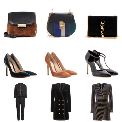 Items shown above left to right:Alexander Wang Prisma skeletal suede and leather shoulder bag now £387, Chloe Drew, leather and suede shoulder bag £880 (out of stock), Saint Laurent classic small monogram suede shoulder bag £880, Gianvito Rossi green velvet pumps £313, Gianvito Rossi brown suede pumps £313, Gucci patent leather pumps £331 (out of stock) H&M black denim boiler suit £35 (out of stock) Balmain double-breasted velvet dress now £1,184, Balmain crystal-embellished velvet mini-dress now £1,782.