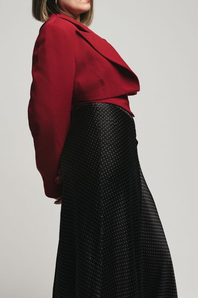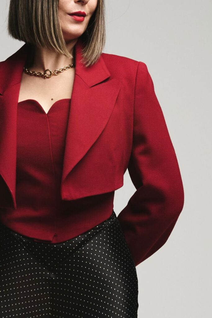 I tend to lean into a classic, yet dramatic elements for big nights. I wanted to redesign this blazer with sharper proportions and a little more tension. Something cropped, with bigger shoulder pads. My style is very classic, with a modern edge and that’s what my dramatic archetype was seeking. So this is what we focused on first, cropping the blazer and making the shoulders, and overall shape more pronounced.